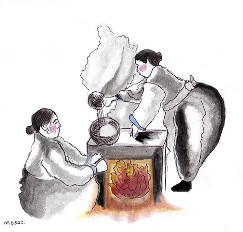Two women tend the hearth for Ondol in Korea. This illustration is for an article published on the moss Design blog about how we gather insulation and architecture inspiration from ancient heating techniques around the world. Read the article here.